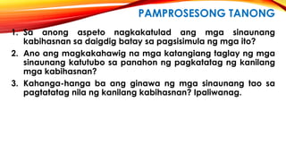Ibigay ang kahalagahan ng tao at kapaligiran sa bawat isa MGA KONTRIBUSYON NG MGA SINAUNANG KABIHASNAN SUMER INDUS AT SHANG 2. Ay naging sentrong pangkabuhayan at politikal sa Mesoamerica. Ang tahanan naman ng mga sinaunang tao sa ating kapuluan ay binubuo ng mga dahon na itinayo sa pamamagitan ng a pat.