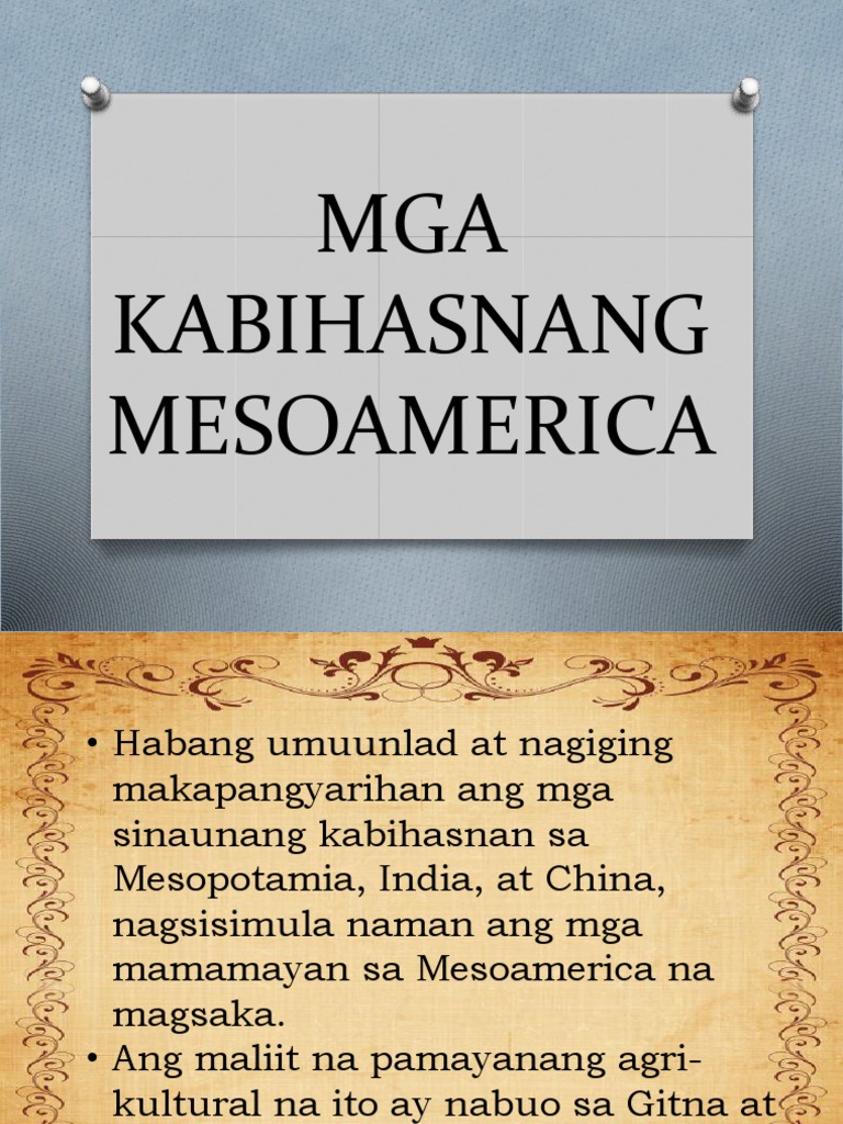MGA KABIHASNAN SA MESOAMERICA MELC BASED - AP8 Q2 philippines asiaConnect with us in our Facebook Page-----. Dahil higit na mataas ang antas ng pamumuhay ng mga taga-Mesoamerica kaysa sa mga kabihasnang itinatag sa Asya at Africa. Maraming siglo muna ang lumipas sa pagitan ng pagsisimula ng pamumuhay sa mga pamayanan at pagkakaroon ng mga lipunang binuo ng estado sa Mesoamerica.